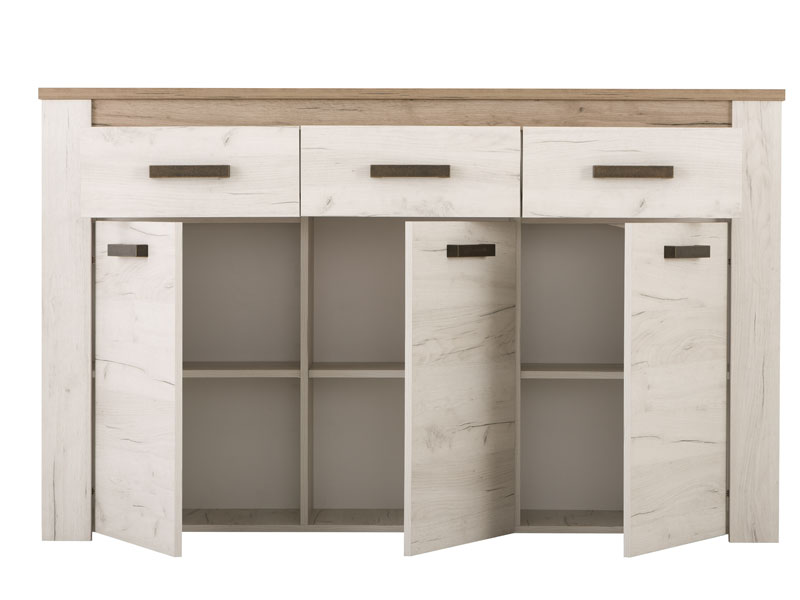 Komoda KENT 160 3K3F, u bijelom i sivom hrast dezenu, posjeduje sistem od tri praktične fioke i tri zatvorena segmenta koja su idealna dopuna garderobnom dijelu. Dio je istoimene kolekcije koja u vaš dom unosi dodir otmene klasike i rafiniranog ukusa.