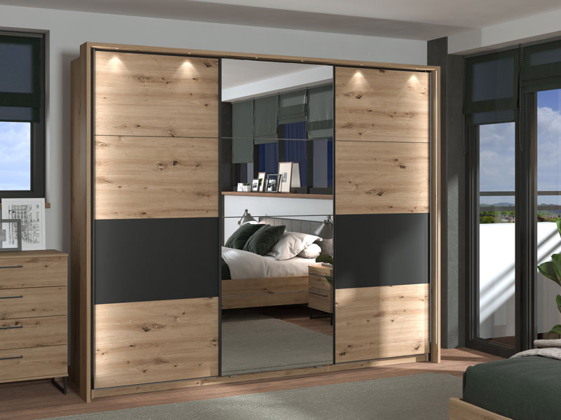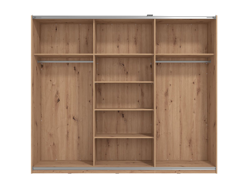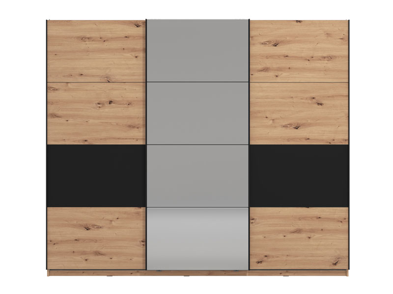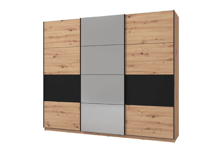 Model kliznog dvokrilnog garderobera SARDINIA 270 OG, u kombinaciji dekora artisan hrasta i crnog dekora, sa ogledalom na centalnom dijelu fronta, spoj je topline naturalnog i rustičnog sa karakteristikama industrijskog stila u dizajnu enterijera. Upotrebni prostor ovog modela čine police u središnjem dijelu i dvije garderobne šipke u levom i desnom dijelu. Pripada istoimenoj kolekciji SARDINIA, sa čijim elementima zaokružuje čitavu enterijersku cjelinu kada je u pitanju opremanje spavaće sobe. Postoji mogućnost ugradnje usporivača kliznog mehanizma, kao i dodatne LED rasvete.
