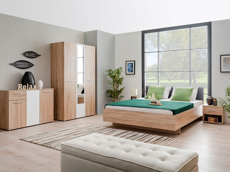 Komoda RITMO 3K1F, u dekoru sonoma hrasta i opak bijele, dio je istoimene kolekcije elemenata spavaće sobe. Sastoji iz tri zatvorena dijela sa horizontalnim policama, i jedne fioke.