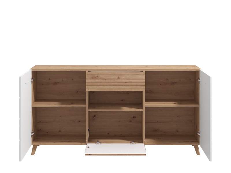 Komoda BRETAGNA 3K1F izrađena je u kombinaciji dekora artisan hrasta sa segmentima u dekoru bijele lak folije, kao i artisan hrast folije, koji unose osvježavajuću estetiku u ambijent. Drvene ručice povezuju dekore u jednu estetsku cjelinu, dok visoki nogari ističu njihovu eleganciju. Odlično raspoređen upotrebni prostor čine jedna praktična fioka, tri zatvorena dijela i otvorena polica. Dio je istoimenog sistema elemenata za uređenje ambijenta dnevnog boravka, koje odlikuju karakteristike modernog dizajna ujedinjene sa prefinjenom notom elegancije.