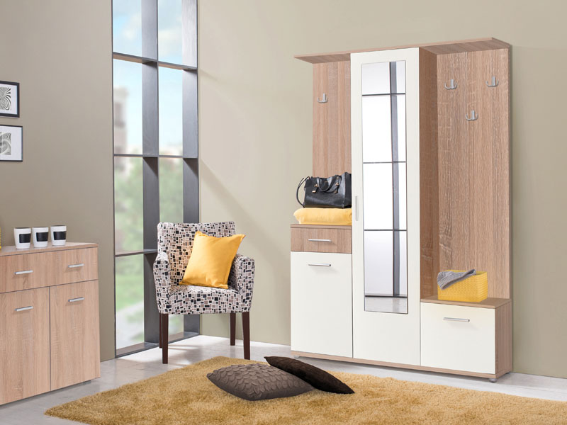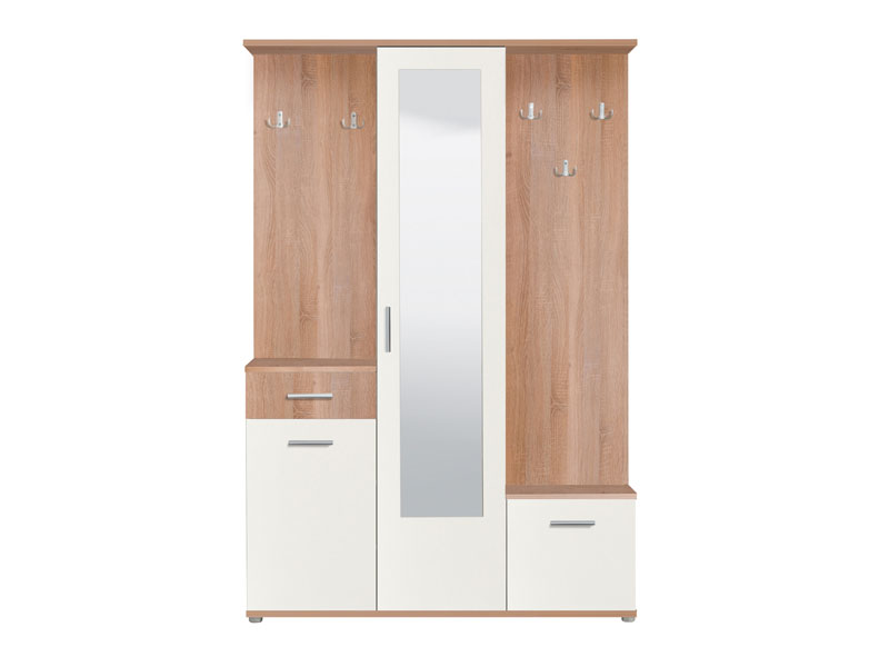 Predsoblje MARTIN, u sonoma hrast i opak bijelom dezenu, učiniće da prvi suret sa vašim domom bude efektan i prijatan. Ovaj model posjeduje skladno organizovan upotrebni prostor za odlaganje sezonske garderobe i obuće tako da ćete postići funkcionalno organizovan prostor, dok centralno pozicionirano ogledalo donosi osećaj prostranosti.