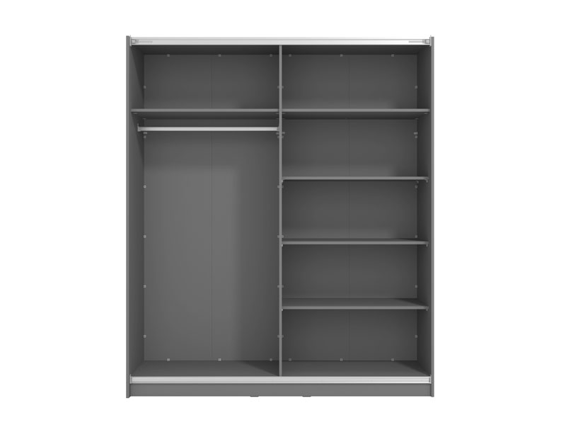 Garderober SIERRA 180 u dekoru grafit sive, predstavlja model garderobera savremenog dizajna i velike praktične upotrebne vrijednosti. Unutrašnjost se sastoji od segmenta sa policama desnom dijelu, kao i segmenta sa garderobnom šipkom u lijevom dijelu. Poseban benefit ovog modela je klizni mehanizam koji doprinosi ekonomičnoj organizaciji raspoloživog prostora, kao i ogledalo na levom kliznom elementu. Posjeduje mogućnost ugradnje usporivača kod kliznog mehanizma koji dodatno doprinose sigurnosti i funkcionalnosti, kao i mogućnost dodavanja LED rasvete.