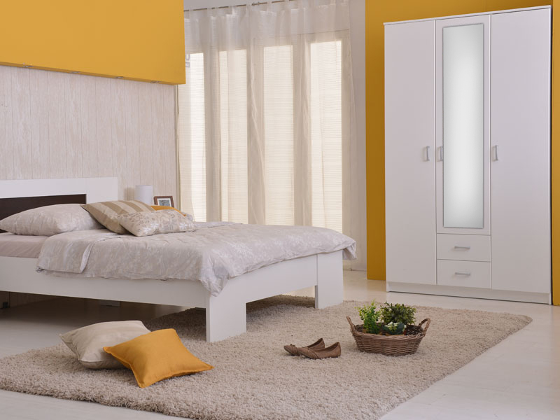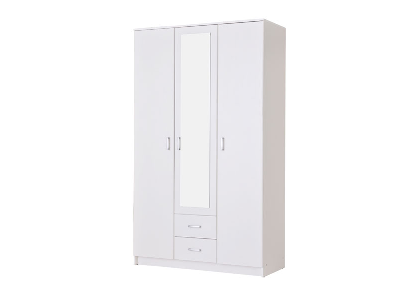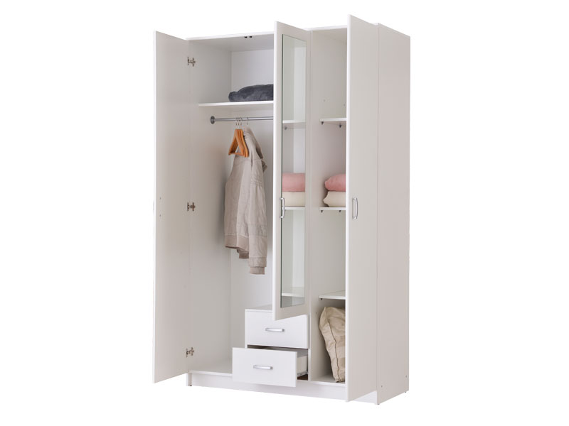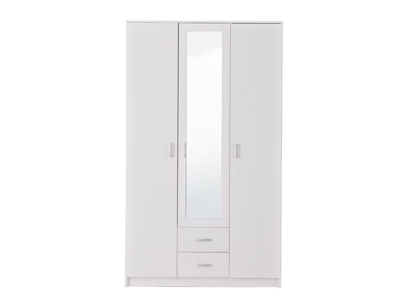 Elegantni trokrilni model ormara HANA 3K2FO, u opak bijelom dezenu, sa garderobnom šipkom, tri police i dvije fioke, funkcionalno će doprinijeti organizaciji ambijenta. Ogledalo na središnjem dijelu ormara HANA 3K2FO estetski će oplemeniti životni prostor.
