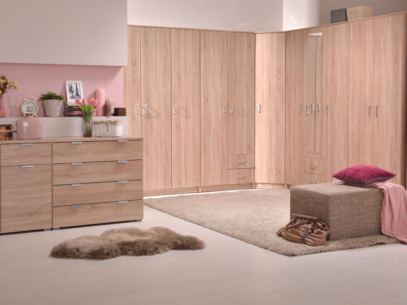 Funkcionalni model ormara HANA UGAONI, u sonoma hrast dezenu, efektno racionalizuje ugaoni prostor u enterijeru namijenjen odlaganju odeće. Uspešno organizovan prostor ormara HANA UGAONI sastoji se od polica i garderobne šipke.