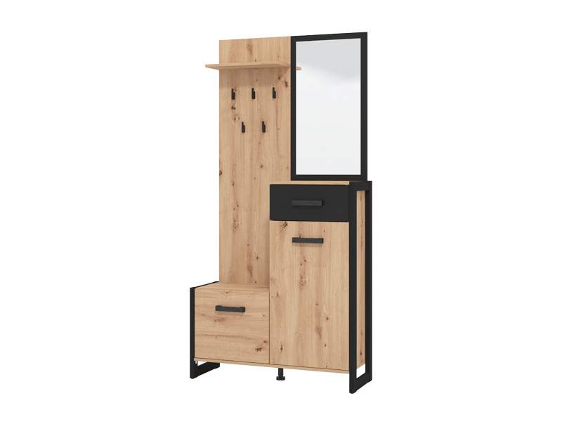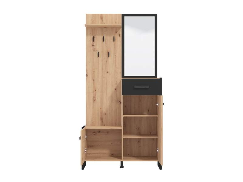 Predsoblje OLERON, u kombinaciji artisan hrast boje, crne boje i crne mat folije, učiniće da prvi suret sa vašim domom bude efektan i prijatan. Ovaj model posjeduje skladno organizovan upotrebni prostor za odlaganje obuće, dok ogledalo donosi osećaj prostranosti.
